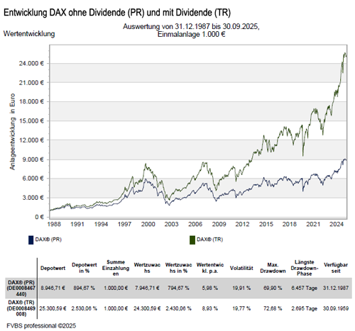 Wertentwicklung vom DAX Index mit Dividende und ohne Dividende seit dem Jahr 1988