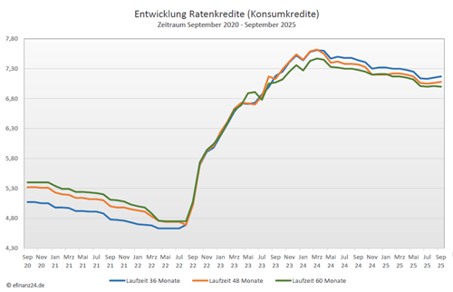 Entwicklung der Zinssätze von Ratenkrediten (Konsumkrediten) mit einer Darlehenslaufzeit von 36, 48 und 60 Monaten im Zeitraum der letzten fünf Jahre