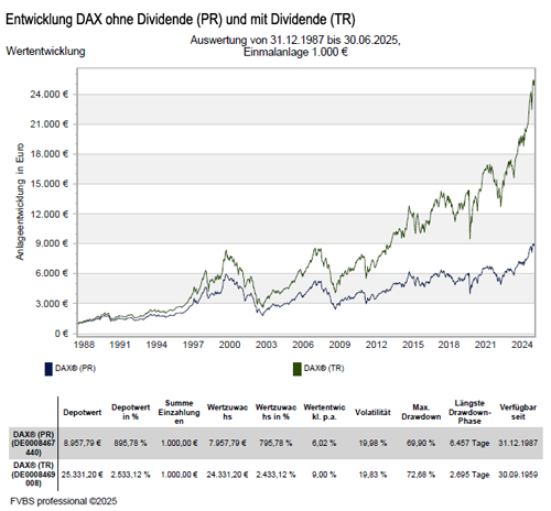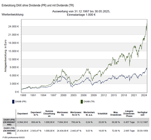 Wertentwicklung vom DAX Index mit Dividende und ohne Dividende seit dem Jahr 1988