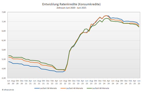 Entwicklung der Zinssätze von Ratenkrediten (Konsumkrediten) mit einer Darlehenslaufzeit von 36, 48 und 60 Monaten im Zeitraum der letzten fünf Jahre