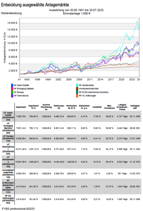 Wertentwicklung von Aktienfonds, Rentenfonds und Immobilienfonds seit dem Jahr 1991 in verschiedenen Anlagemärkten