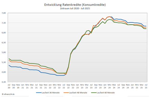 Entwicklung der Zinssätze von Ratenkrediten (Konsumkrediten) mit einer Darlehenslaufzeit von 36, 48 und 60 Monaten im Zeitraum der letzten fünf Jahre
