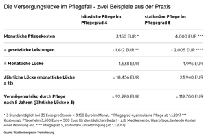 Pflegegrad 5 – schwerste Beeinträchtigung der Selbständigkeit mit besonderen Anforderungen an die pflegerische Versorgung Vermögensrisiko bei häuslicher und stationärer Pflege Wie groß eine Versorgungslücke im Pflegefall sein kann, wird mit den beiden folgenden Beispielen aufgezeigt. Das erste bei häuslicher, ambulanter Pflege und das zweite bei einem stationären Aufenthalt in einem Pflegeheim.