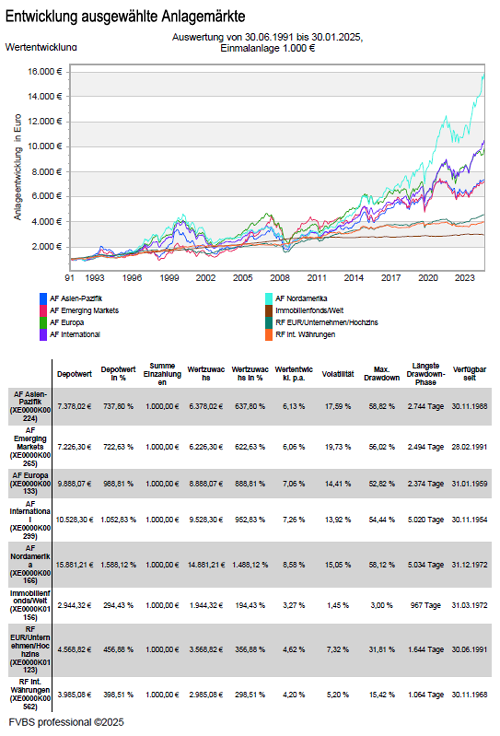 Wertentwicklung von Aktienfonds, Rentenfonds und Immobilienfonds seit dem Jahr 1991 in verschiedenen Anlagemärkten