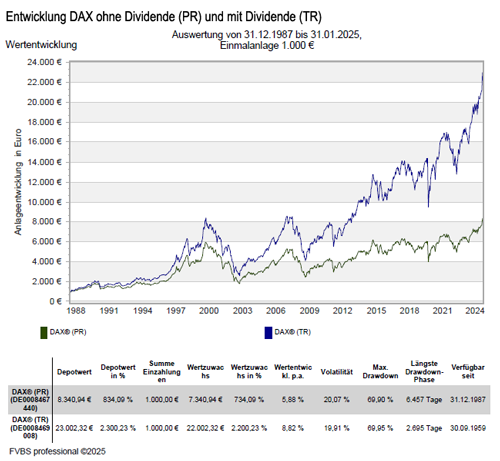 Wertentwicklung vom DAX Index mit Dividende und ohne Dividende seit dem Jahr 1988
