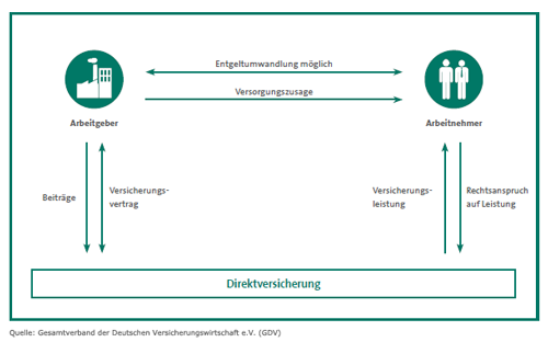 Bei der Direktversicherung schließt der Arbeitgeber per Einzeloder Gruppenvertrag eine Lebensversicherung für seine Arbeitnehmer bei einem Versicherer ab. Versicherungsnehmer und Beitragsschuldner ist somit der Arbeitgeber – Begünstigter oder auch Bezugsberechtigter aber ist der Arbeitnehmer bzw. seine Hinterbliebenen. Die Aufwendungen sind für den Arbeitgeber voll abzugsfähige Betriebsausgaben. Direktversicherungen unterliegen der staatlichen Versicherungsaufsicht durch die Bundesanstalt für Finanzdienstleistungsaufsicht (BaFin) und der Anlageregulierung nach dem Versicherungsaufsichtsgesetz. Dabei steht die Sicherheit der zugesagten Leistung im Vordergrund. So müssen die Versicherungsunternehmen sämtliche Vermögenswerte so anlegen, dass Sicherheit, Qualität, Liquidität und Rentabilität des Portfolios als Ganzes sicher gestellt werden. Auch bei der fondsgebundenen Direktversicherung werden durch ausgewogene Kapitalanlage die arbeitsrechtlich geforderten Mindestleistungen sicher gestellt. Bei der Direktversicherung ist der Arbeitgeber bis auf bestimmte Ausnahmefälle nicht zur Zahlung von Beiträgen an den Pensions-Sicherungs-Verein (PSVaG) verpflichtet.