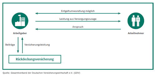Um diese betriebsfremden Risiken abzusichern und bei Eintritt des Versorgungsfalles das erforderliche Kapital garantiert zur Verfügung zu haben, ist vor allem Arbeitgebern kleinerer und mittlerer Unternehmen dringend der Abschluss einer Rückdeckungsversicherung zu empfehlen. Eine Vielzahl von Versicherern bietet entsprechende Rückdeckungsversicherungen an. Für Beiträge oder Zuwendungen gibt es grundsätzlich keine Obergrenzen. Auf Grund des relativ hohen Verwaltungsaufwandes eignet sich die Direktzusage in aller Regel nicht für kleinere Betriebe.