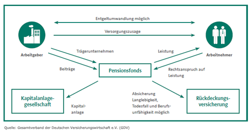 Den Pensionsfonds gibt es zunächst in einer versicherungsförmigen Ausgestaltung, bei der der Pensionsfonds die Leistungen wie ein Lebensversicherer garantiert. Der Pensionsfonds kann seine Leistungen aber auch nicht versicherungsförmig zusagen, etwa in Fällen der Übernahme einer vom Arbeitgeber erteilten Direktzusage. In diesem Fall werden die vom Arbeitgeber für die Übertragung aufzubringenden Beiträge an den Pensionsfonds mit einem marktnahen Zins berechnet. Sollten allerdings die im Pensionsfonds vorhandenen Mittel nicht zur vollständigen Finanzierung der zugesagten Leistungen ausreichen, ist der Arbeitgeber zu Beginn der Auszahlungsphase zum Nachschuss verpflichtet. Bei einer Insolvenz des Arbeitgebers sind die Anwartschaften und Ansprüche der Arbeitnehmer wie bei der Direkt- und Unterstützungskassenzusage über den Pensions-Sicherungs-Verein (PSVaG) abgesichert. Der Beitrag des Arbeitgebers zum Pensions-Sicherungs-Verein ist dabei aber erheblich niedriger als der Regelbeitrag.