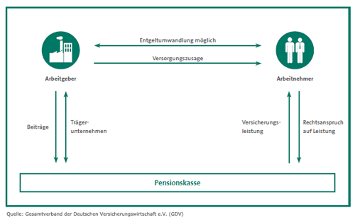 Pensionskassen sind rechtlich selbstständige Unternehmen. Sie werden von einem oder mehreren Arbeitgebern getragen und sind aufsichtsrechtlich Versicherungen. Pensionskassen gewähren den Arbeitnehmern und deren Hinterbliebenen einen Rechtsanspruch auf die zugesagten Leistungen. Sie finanzieren sich über Zuwendungen der Trägerunternehmen und aus Vermögenserträgen. Wie andere Versicherungen unterliegen sie der staatlichen Aufsicht durch die Bundesanstalt für Finanzdienstleistungsaufsicht (BaFin). Pensionskassen müssen ihr Vermögen eher konservativ anlegen. Wie bei der klassischen Direktversicherung steht eine kontinuierliche und sichere Rendite im Vordergrund.