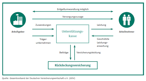 Eine Unterstützungskasse ist eine rechtlich selbstständige Versorgungseinrichtung eines Unternehmens oder mehrerer Unternehmen, zumeist in der Rechtsform eines eingetragenen Vereins. Die Zahlungen an die Unterstützungskasse werden vom Arbeitgeber geleistet – finanziert entweder direkt von ihm selbst oder durch Entgeltumwandlung, also vom Bruttogehalt des Arbeitnehmers. Ähnlich wie bei der Direktzusage sind die Ansprüche der Arbeitnehmer bei Insolvenz des Arbeitgebers über den Pensions-Sicherungs-Verein (PSVaG) geschützt.