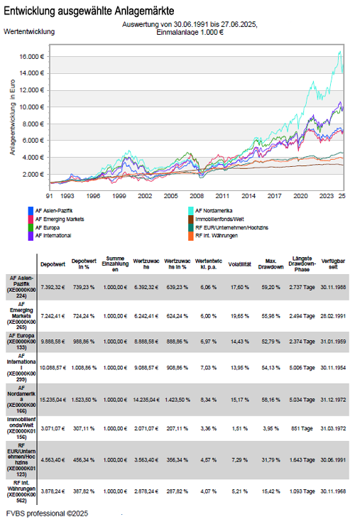 Wertentwicklung von Aktienfonds, Rentenfonds und Immobilienfonds seit dem Jahr 1991 in verschiedenen Anlagemärkten